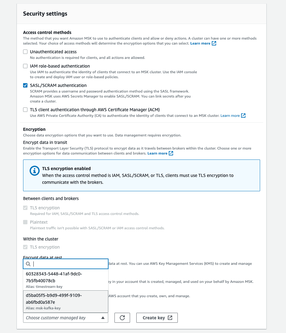 - Unauthenticated access must be turned off, and at least one secured access method must be on of SASL/IAM, SASL/SCRAM, or mTLS. You'll likely want to use SASL/SCRAM. You'll need to create a username an password, enroll them in AWS Secrets Manager, and configure Kafka to use that.